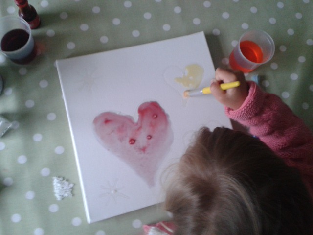 On the first smaller canvas we used PVA glue to draw our heart outlines.